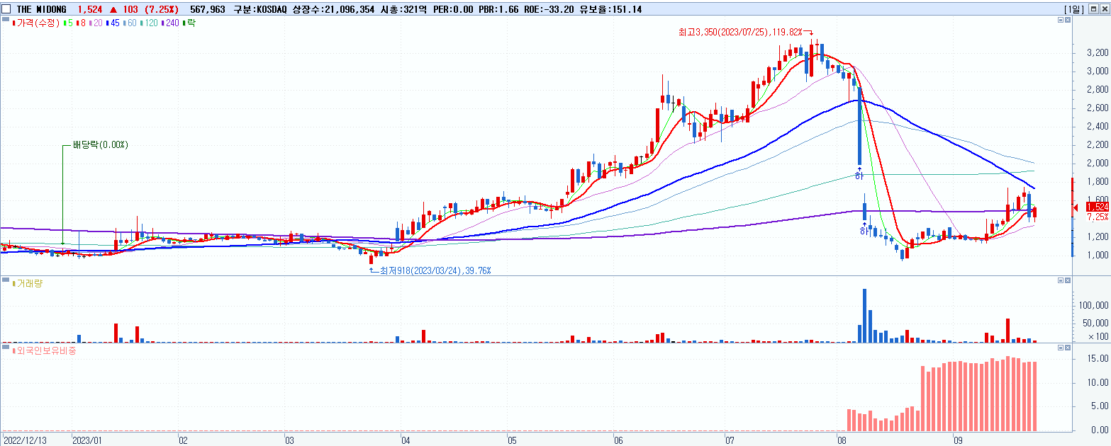 29.THE MIDONG 1,524원 ▲ 7.25% (KOSDAQ, 161570)