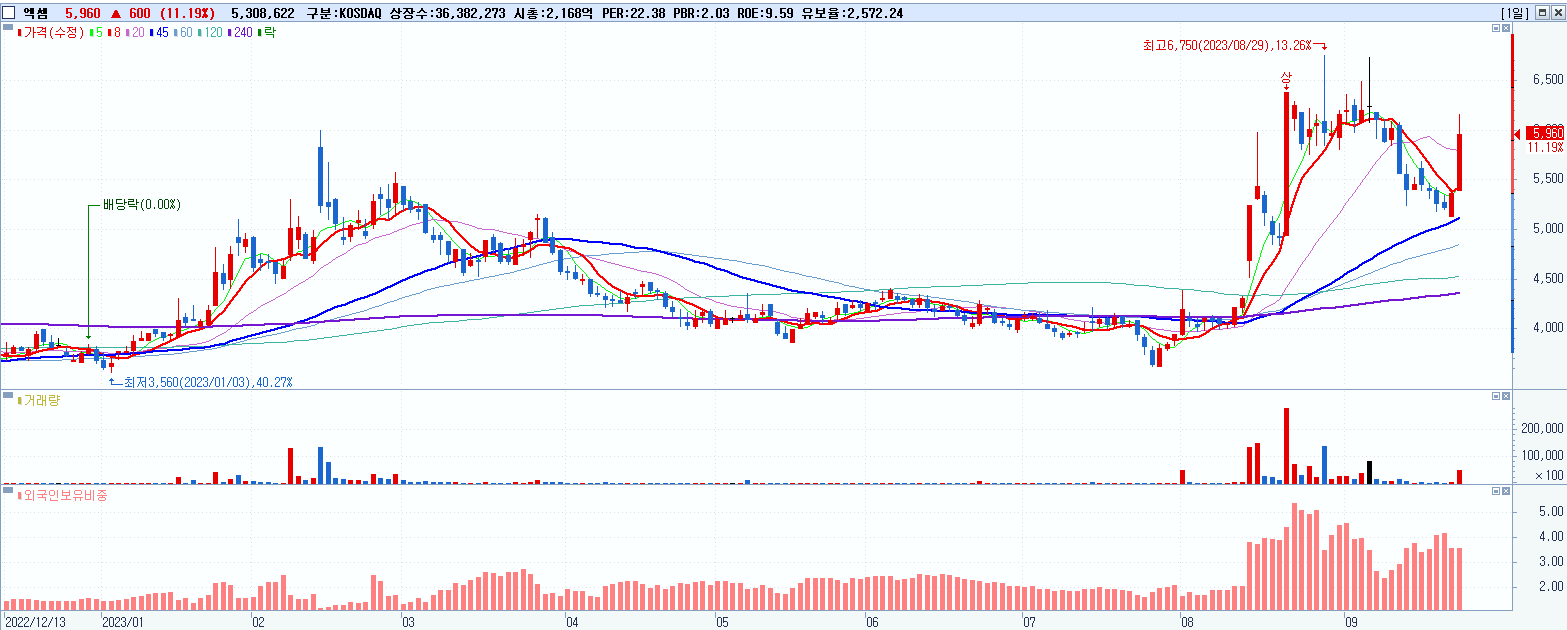 - 엑셈 (5,960원 ▲ 11.19% , 시총: 2,168억, 거래량: 5,327,184, 거래대금:314억)