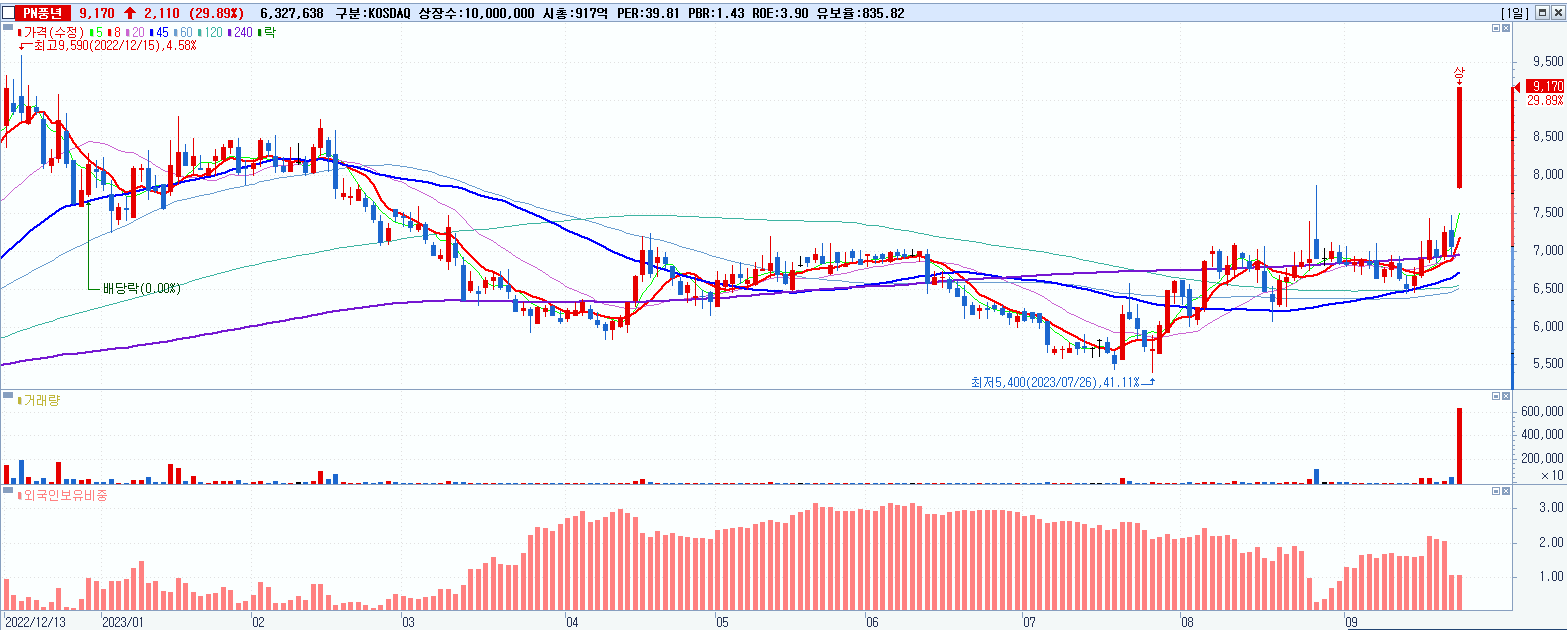 4.PN풍년 9,170원 ▲ 29.89% (KOSDAQ, 024940)