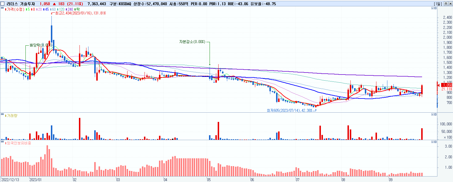 - 리더스 기술투자 (1,050원 ▲ 21.11% , 시총: 551억, 거래량: 7,862,793, 거래대금:79억)