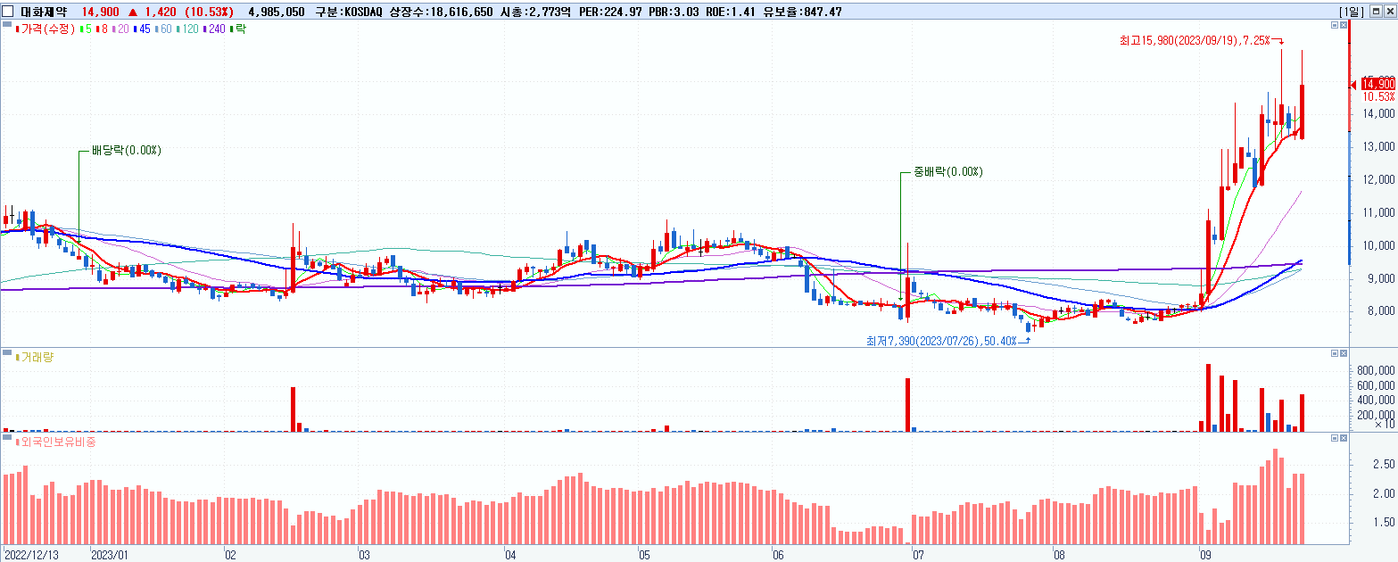 - 대화제약 (14,900원 ▲ 10.53% , 시총: 2,774억, 거래량: 4,995,493, 거래대금:755억)