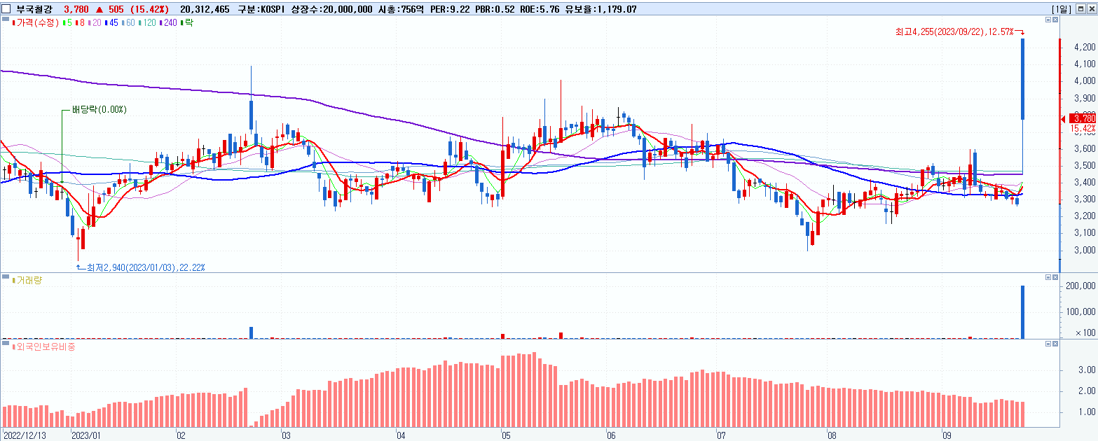 - 부국철강 (3,780원 ▲ 15.42% , 시총: 756억, 거래량: 20,559,342, 거래대금:809억)