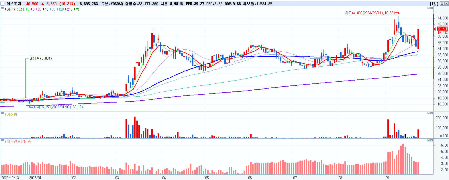 - 에스피지 (40,500원 ▲ 16.21% , 시총: 8,982억, 거래량: 8,986,497, 거래대금:3,536억)