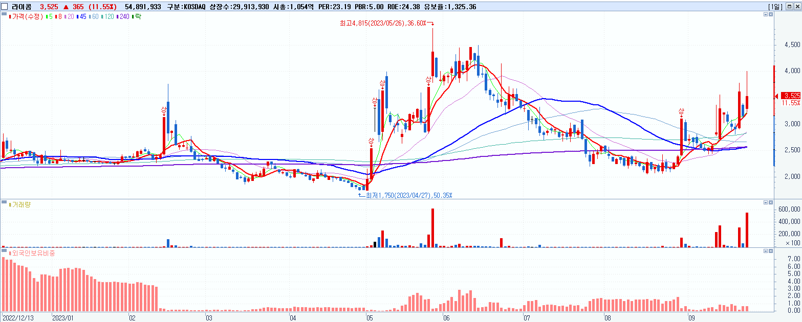 - 라이콤 (3,525원 ▲ 11.55% , 시총: 1,054억, 거래량: 55,247,199, 거래대금:2,025억)