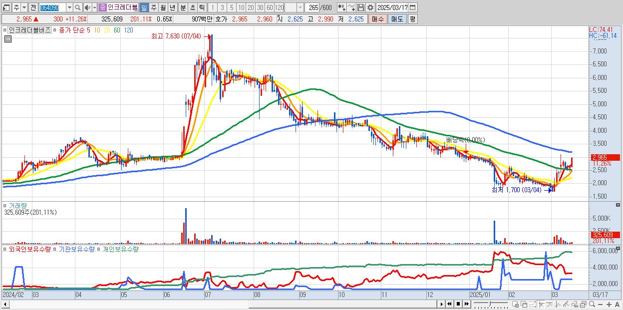 - 인크레더블버즈 (2,965원 ▲ 11.26% , 시총: 1,475억, 거래량: 325,609, 거래대금:9억)