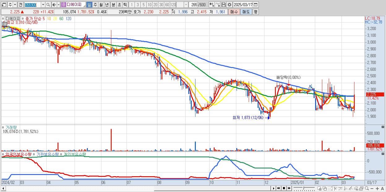 - 디에이피 (2,225원 ▲ 11.42% , 시총: 506억, 거래량: 105,074, 거래대금:2억)