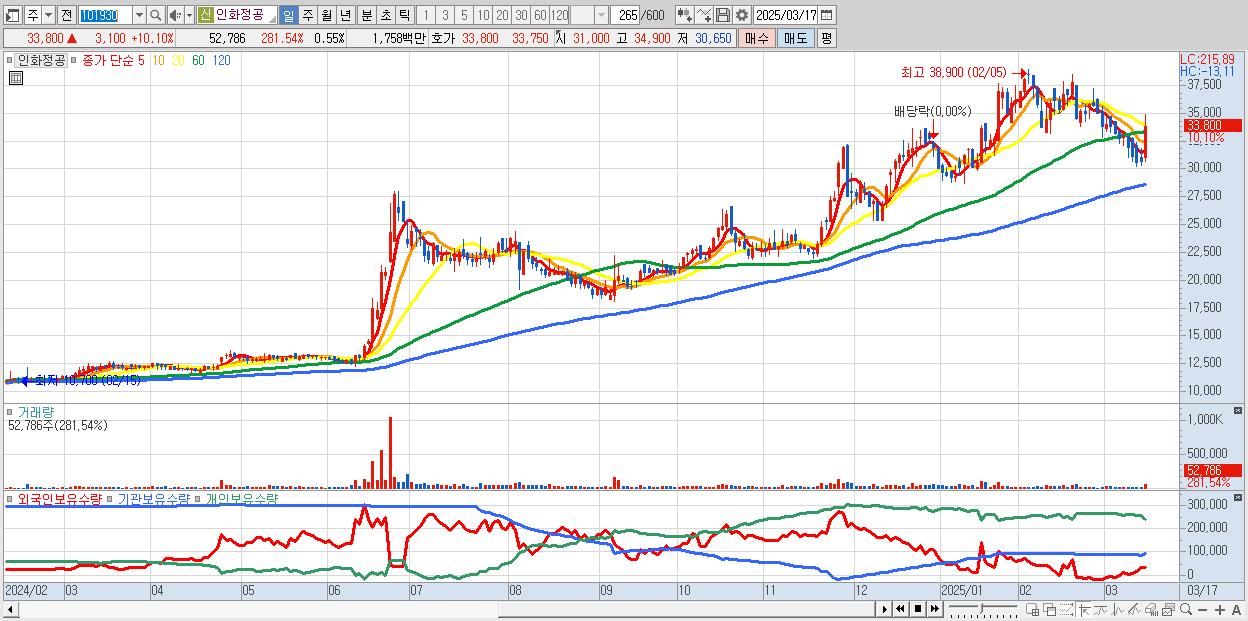 - 인화정공 (33,800원 ▲ 10.1% , 시총: 3,250억, 거래량: 52,786, 거래대금:18억)
