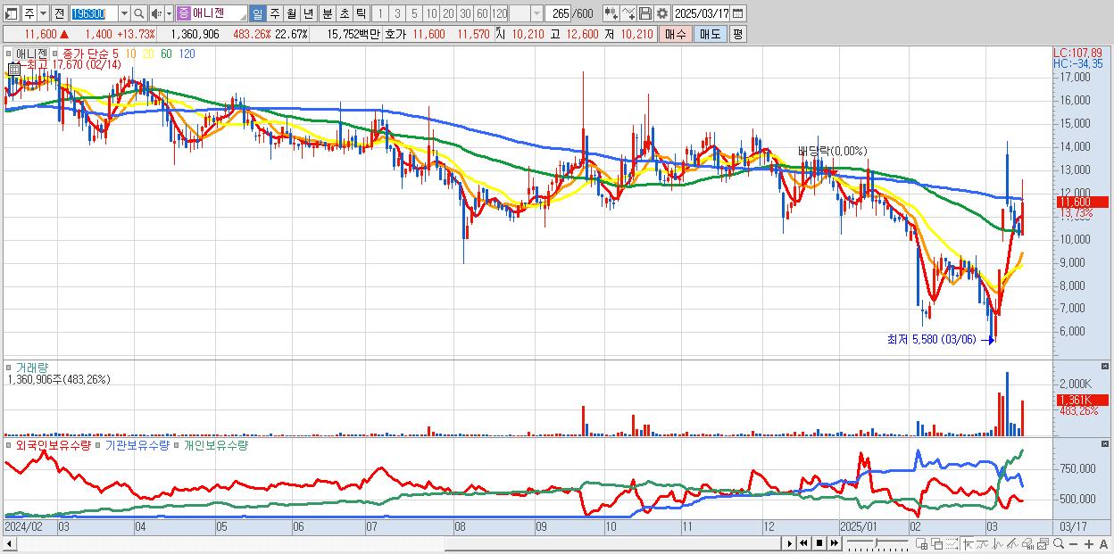- 애니젠 (11,600원 ▲ 13.73% , 시총: 696억, 거래량: 1,360,906, 거래대금:158억)