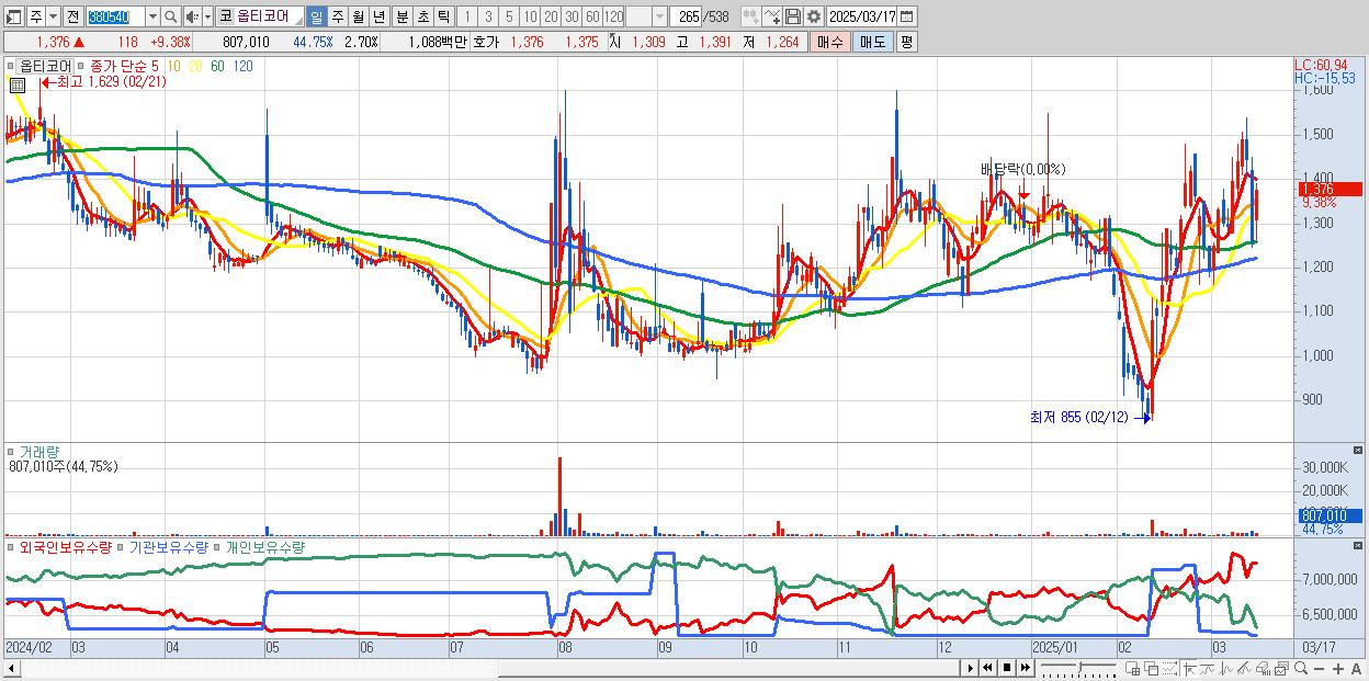 - 옵티코어 (1,376원 ▲ 9.38% , 시총: 411억, 거래량: 807,010, 거래대금:11억)