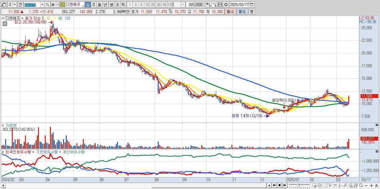 - 디엔에프 (11,500원 ▲ 12.41% , 시총: 1,331억, 거래량: 263,227, 거래대금:29억)