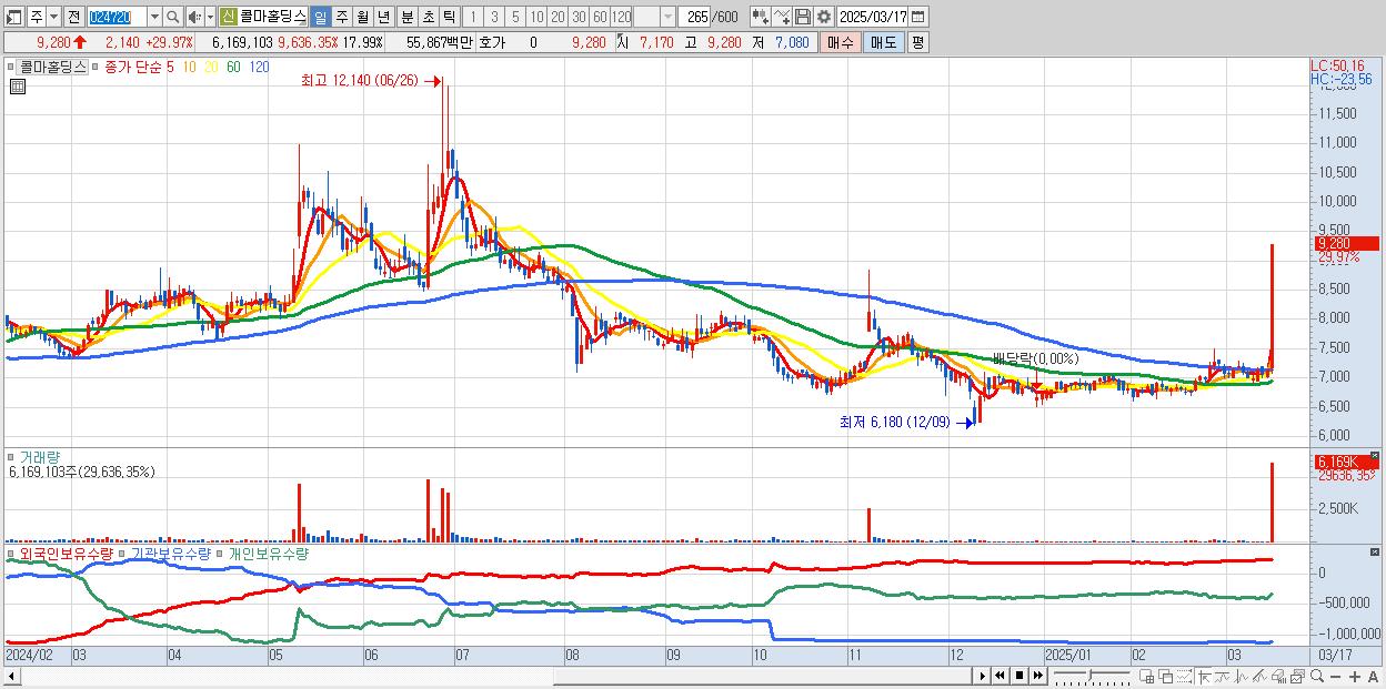 - 콜마홀딩스 (9,280원 ▲ 29.97% , 시총: 3,183억, 거래량: 6,169,103, 거래대금:559억)