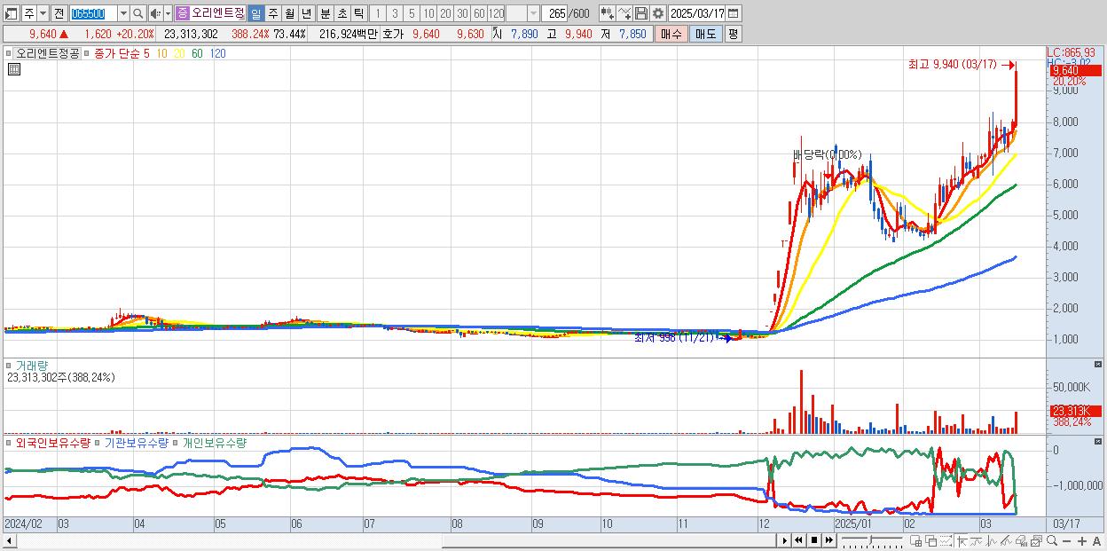 - 오리엔트정공 (9,640원 ▲ 20.2% , 시총: 3,060억, 거래량: 23,313,302, 거래대금:2,169억)