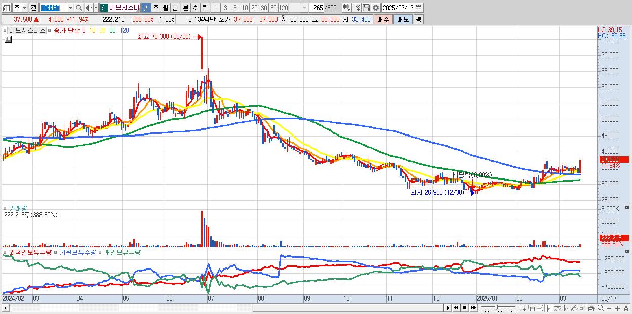 - 데브시스터즈 (37,500원 ▲ 11.94% , 시총: 4,516억, 거래량: 222,218, 거래대금:81억)