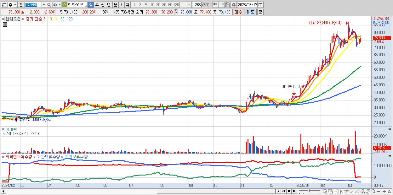 - 한화오션 (76,300원 ▲ 2.69% , 시총: 233,793억, 외국인 순매수 거래금:175억)