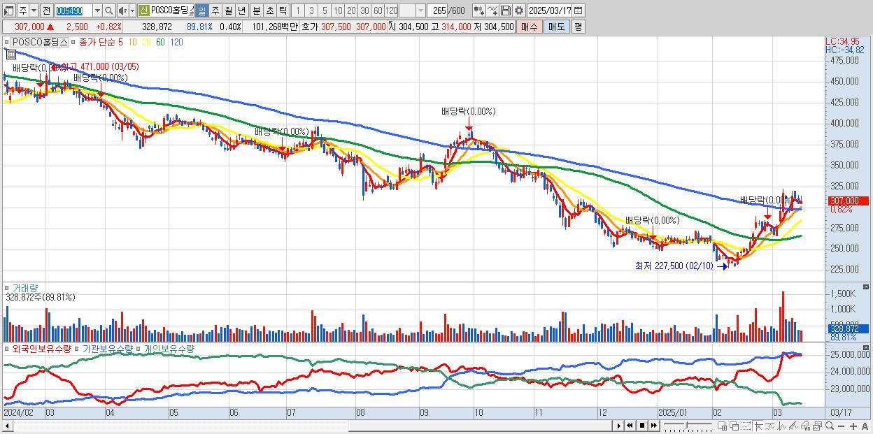 - POSCO홀딩스 (307,000원 ▲ 0.82% , 시총: 253,657억, 외국인 순매수 거래금:67억)