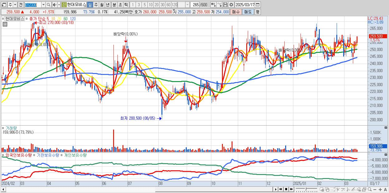 - 현대모비스 (259,500원 ▲ 1.57% , 시총: 241,322억, 외국인 순매수 거래금:42억)