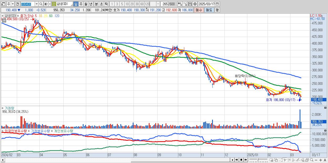 - 삼성SDI (190,400원 ▼ -0.52% , 시총: 130,928억, 외국인 순매수 거래금:52억)