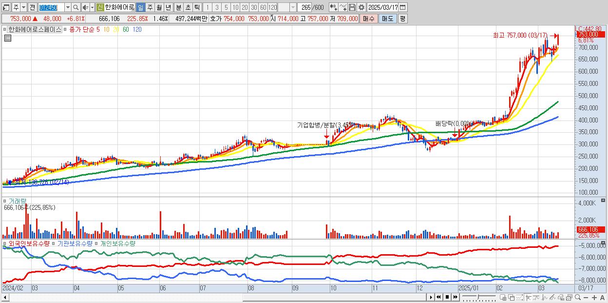 2.한화에어로스페이스 753,000원 ▲ 6.81% (KOSPI, 012450)
