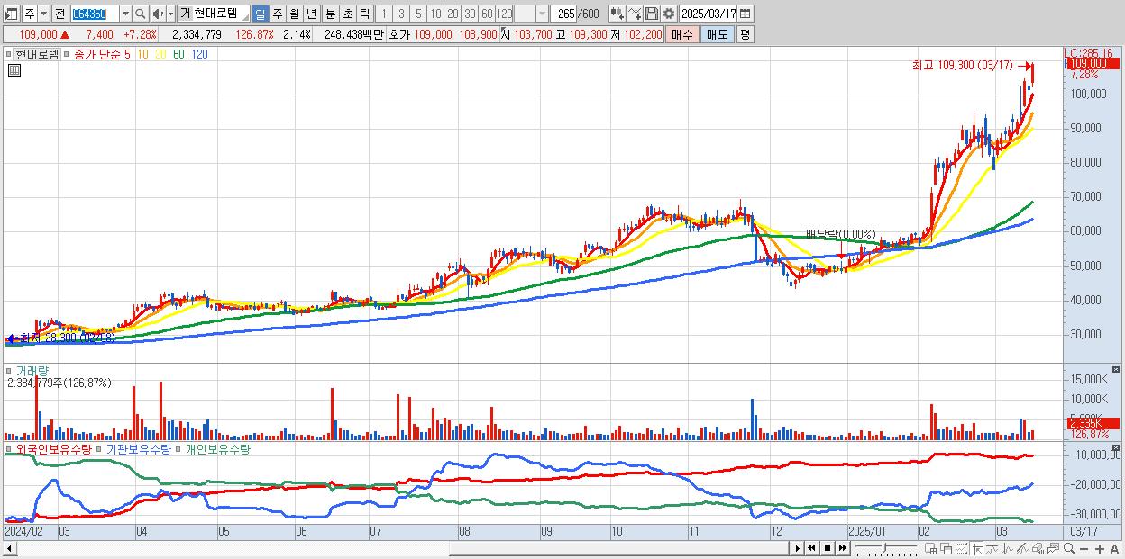 - 현대로템 (109,000원 ▲ 7.28% , 시총: 118,965억, 외국인 순매수 거래금:88억)