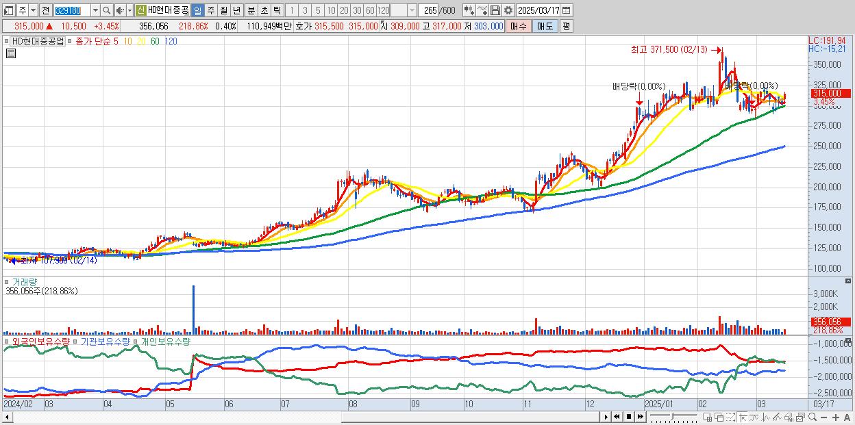 - HD현대중공업 (315,000원 ▲ 3.45% , 시총: 279,635억, 외국인 순매수 거래금:145억)