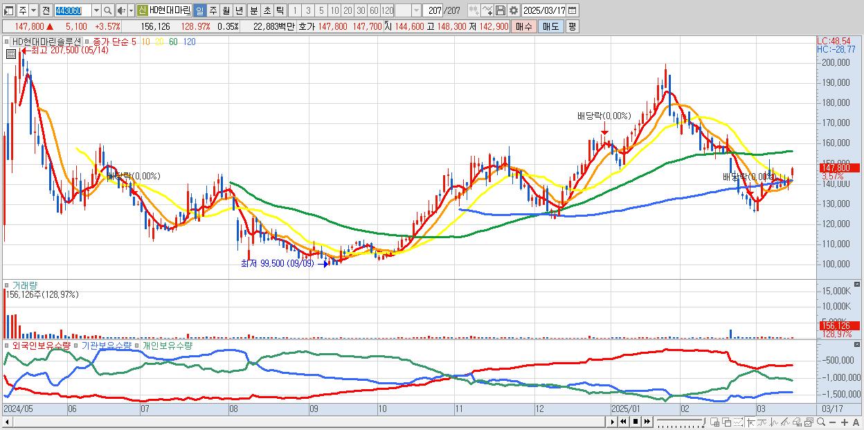 - HD현대마린솔루션 (147,800원 ▲ 3.57% , 시총: 66,258억, 외국인 순매수 거래금:65억)