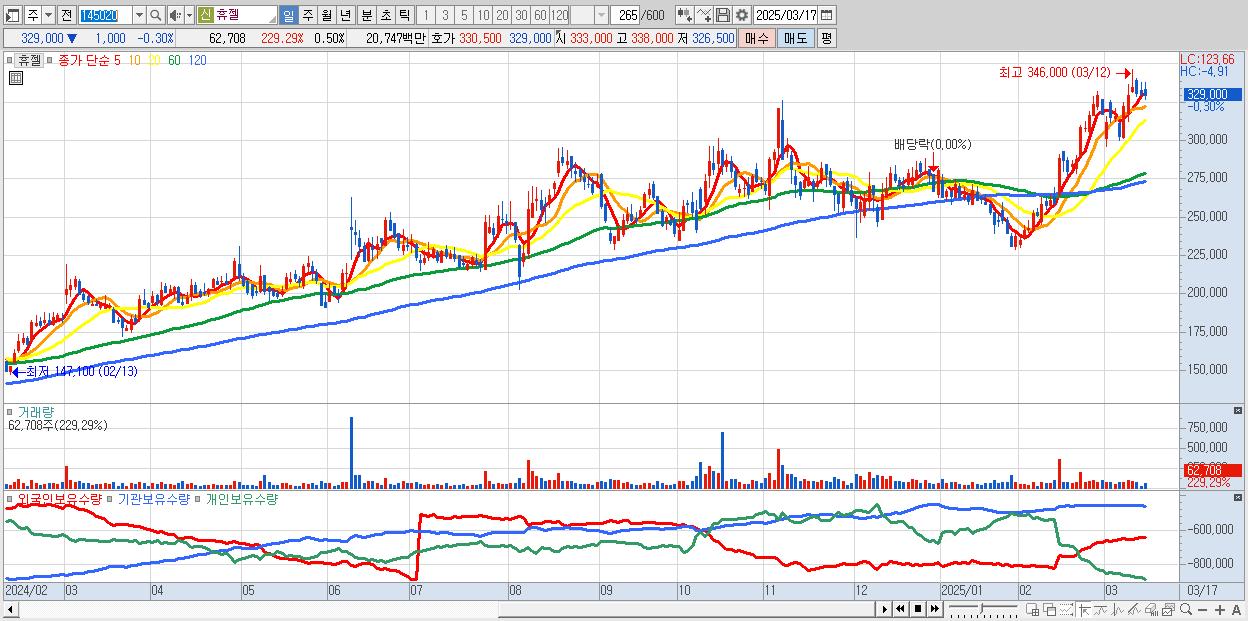 - 휴젤 (329,000원 ▼ -0.3% , 시총: 41,467억, 외국인 순매수 거래금:72억)