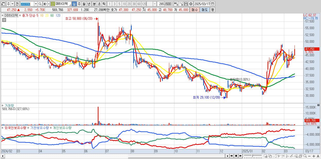 - DB하이텍 (47,250원 ▲ 5.7% , 시총: 20,978억, 외국인 순매수 거래금:44억)