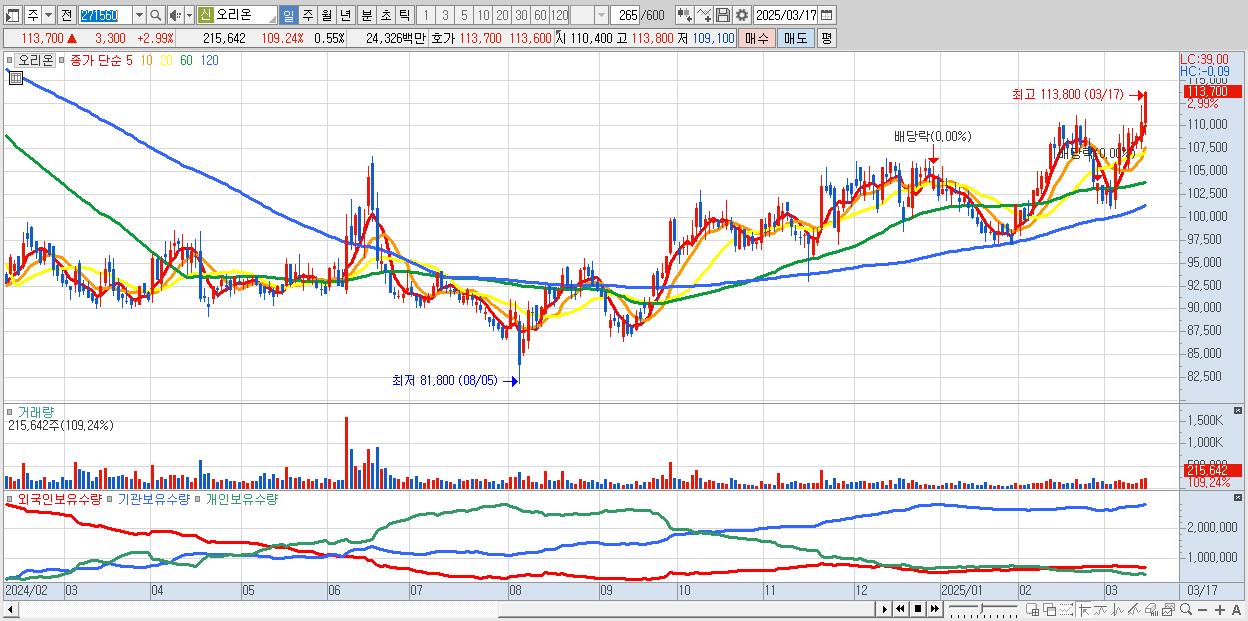 - 오리온 (113,700원 ▲ 2.99% , 시총: 44,953억, 거래량: 215,642, 거래대금:243억, KOSPI)