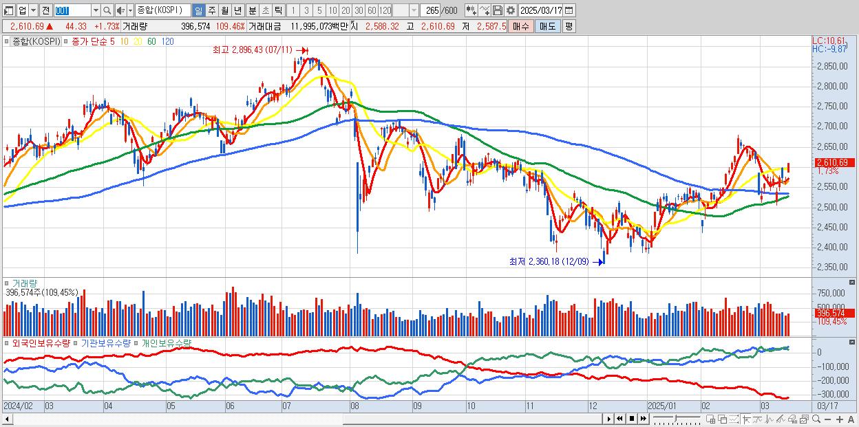 | 03/17 | 2,610.69 | ▲1.73% | -11,804억 | 6,152억 | 4,947억 | 704억 |