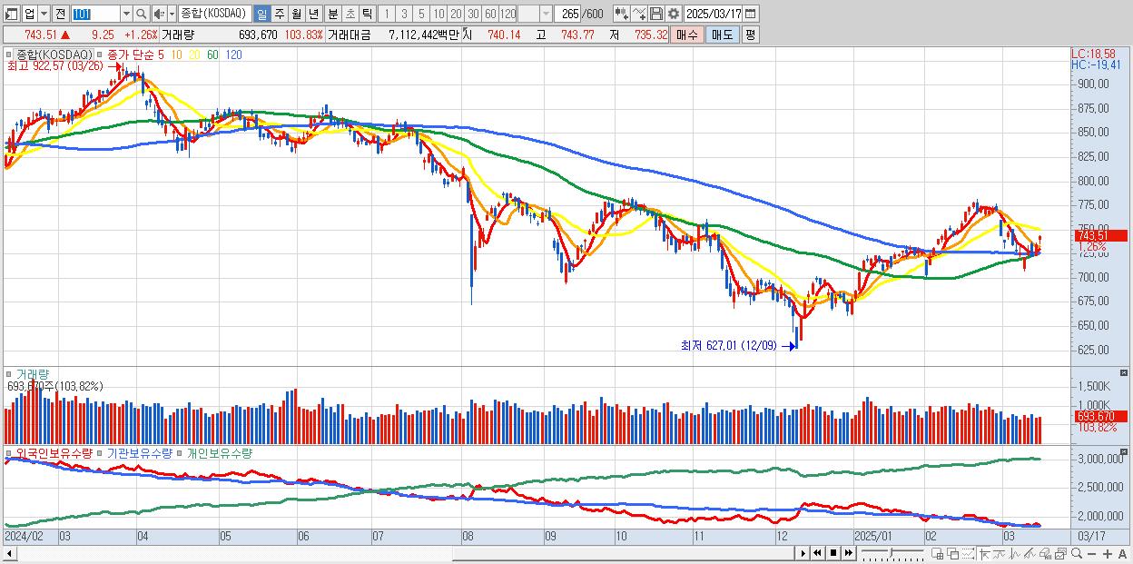 | 03/17 | 743.51 | ▲1.26% | 1,195억 | -1,161억 | -32억 | -2억 |