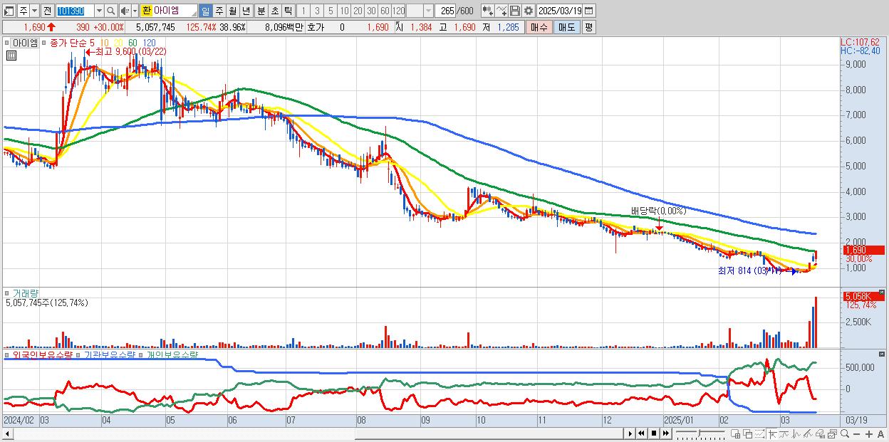 - 아이엠 (1,690원 ▲ 30% , 시총: 219억, 거래량: 5,057,745, 거래대금:81억)