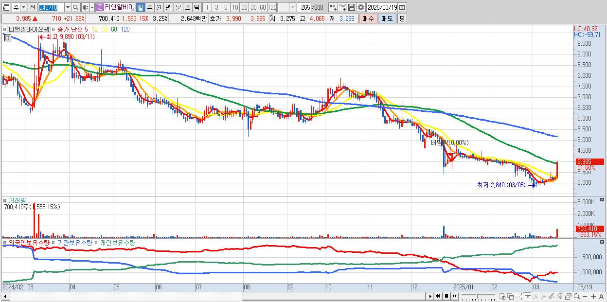 - 티앤알바이오팹 (3,985원 ▲ 21.68% , 시총: 859억, 거래량: 700,410, 거래대금:26억)