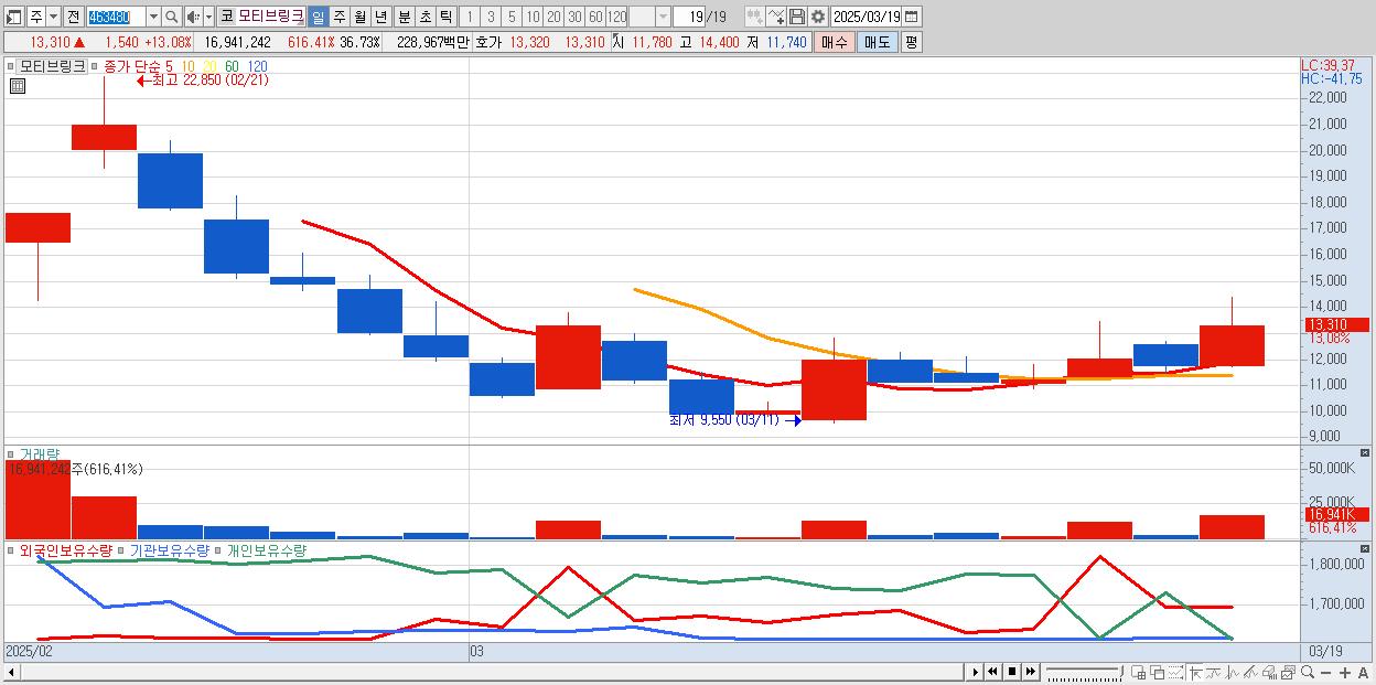 - 모티브링크 (13,310원 ▲ 13.08% , 시총: 1,649억, 거래량: 16,941,242, 거래대금:2,290억)