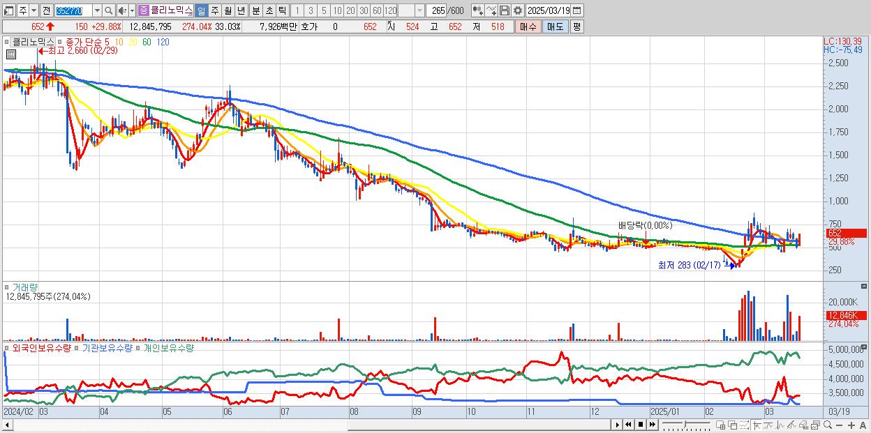 - 클리노믹스 (652원 ▲ 29.88% , 시총: 254억, 거래량: 12,845,795, 거래대금:79억)