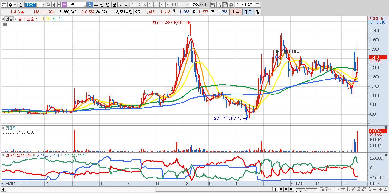 - 신풍 (1,413원 ▲ 11.7% , 시총: 494억, 거래량: 8,660,340, 거래대금:126억)