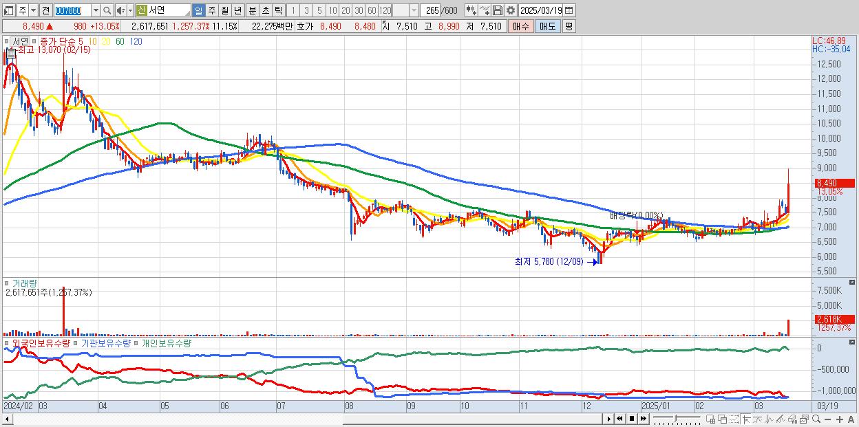 - 서연 (8,490원 ▲ 13.05% , 시총: 1,993억, 거래량: 2,617,651, 거래대금:223억)