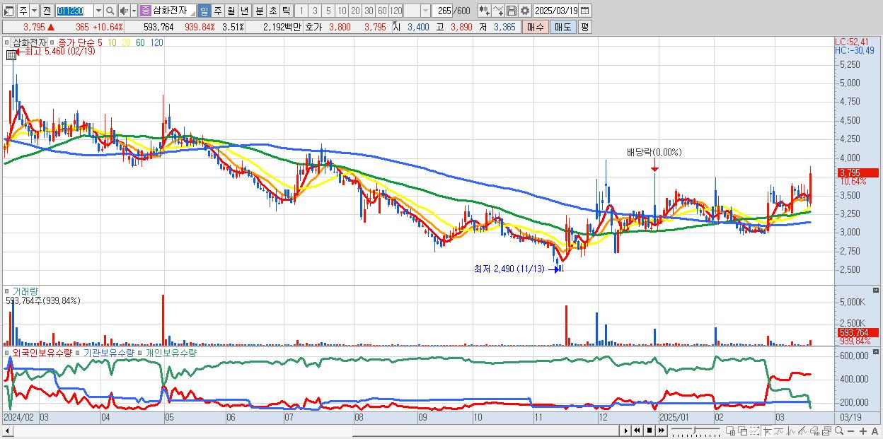 - 삼화전자 (3,795원 ▲ 10.64% , 시총: 641억, 거래량: 593,764, 거래대금:22억)