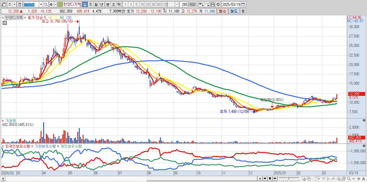 - 한양디지텍 (12,200원 ▲ 9.12% , 시총: 1,860억, 거래량: 682,059, 거래대금:80억)
