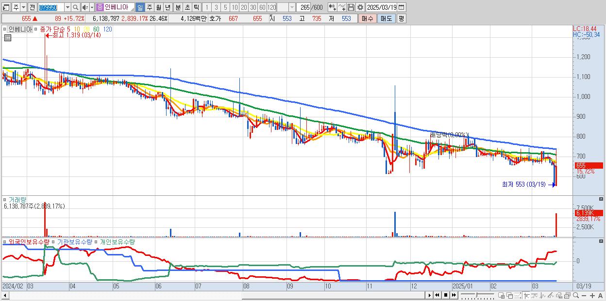 - 인베니아 (655원 ▲ 15.72% , 시총: 152억, 거래량: 6,138,787, 거래대금:41억)