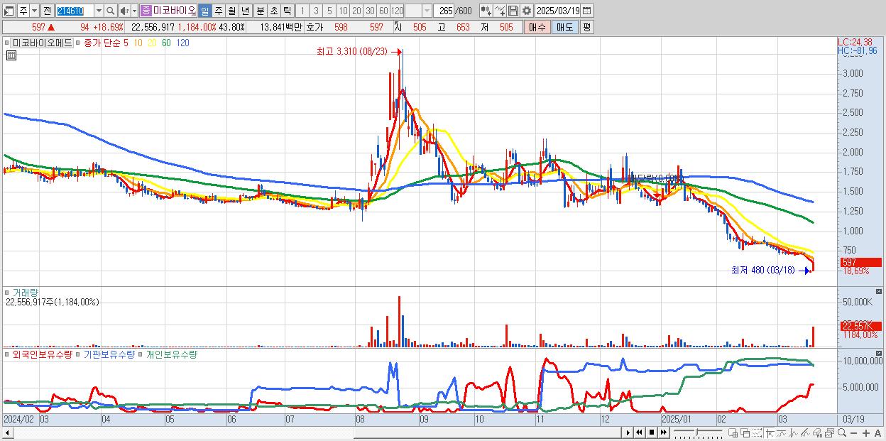 - 미코바이오메드 (597원 ▲ 18.69% , 시총: 307억, 거래량: 22,556,917, 거래대금:138억)
