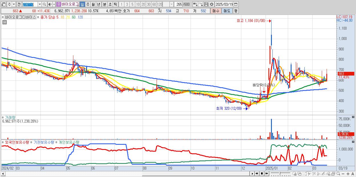 - 바이오로그디바이스 (663원 ▲ 11.43% , 시총: 437억, 거래량: 6,962,971, 거래대금:47억)