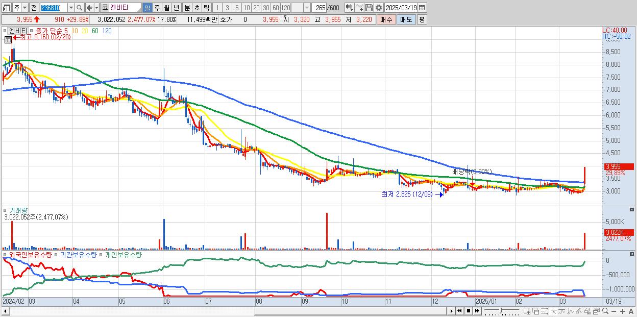 - 엔비티 (3,955원 ▲ 29.89% , 시총: 671억, 거래량: 3,022,052, 거래대금:115억)