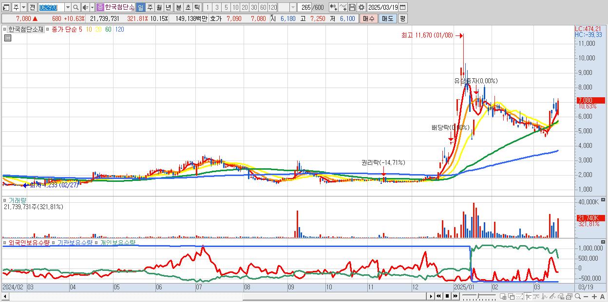 - 한국첨단소재 (7,080원 ▲ 10.63% , 시총: 1,397억, 거래량: 21,739,731, 거래대금:1,491억)