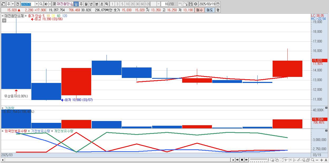 - 대진첨단소재 (15,020원 ▲ 17.9% , 시총: 2,222억, 거래량: 19,357,754, 거래대금:2,967억)