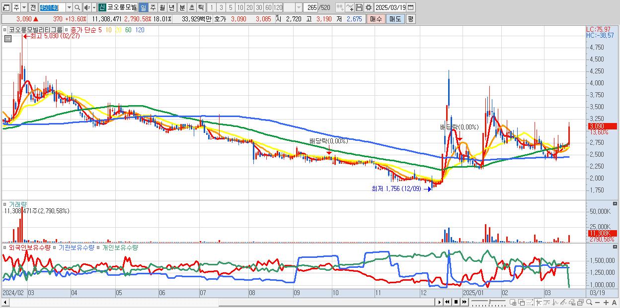 - 코오롱모빌리티그룹 (3,090원 ▲ 13.6% , 시총: 1,940억, 거래량: 11,308,471, 거래대금:339억)