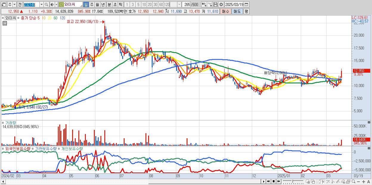 - 와이씨 (12,950원 ▲ 9.38% , 시총: 10,625억, 거래량: 14,639,839, 거래대금:1,895억)