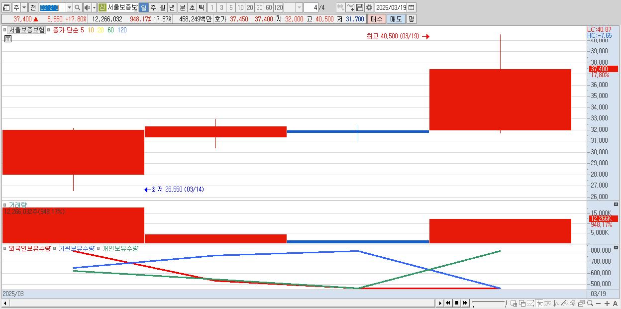 - 서울보증보험 (37,400원 ▲ 17.8% , 시총: 26,113억, 거래량: 12,266,032, 거래대금:4,582억)