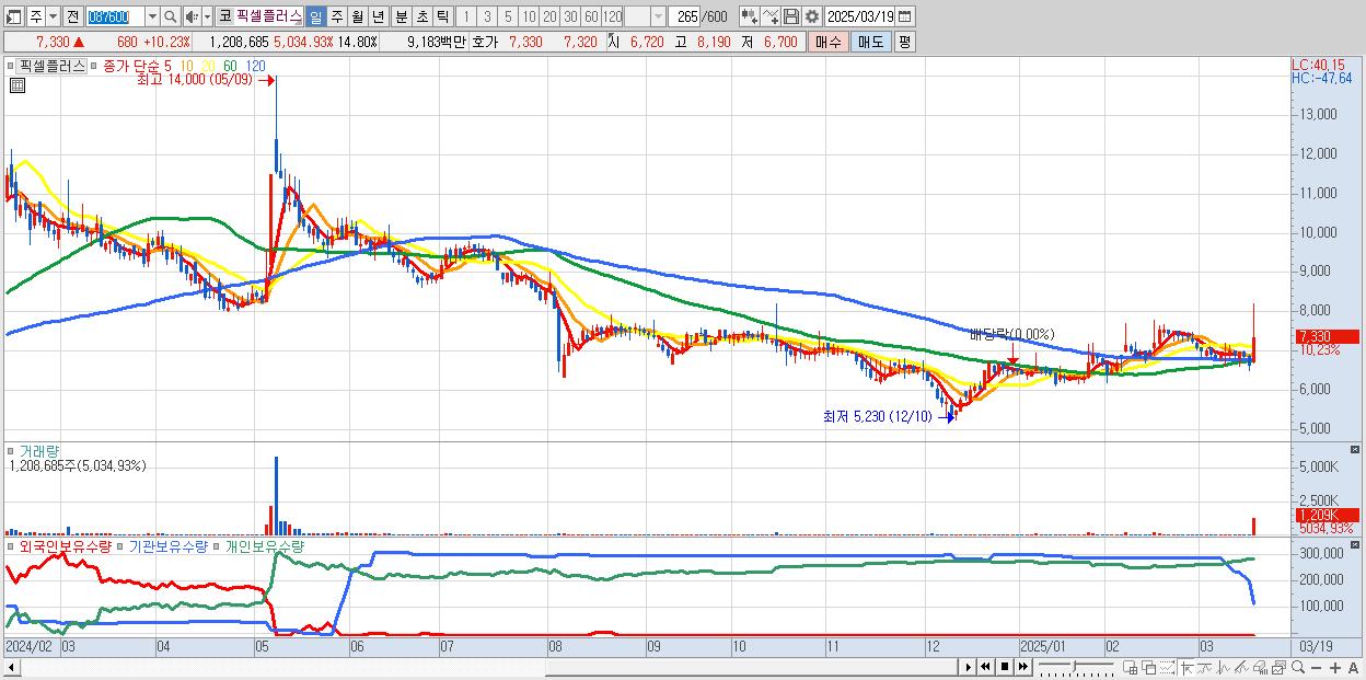 - 픽셀플러스 (7,330원 ▲ 10.23% , 시총: 599억, 거래량: 1,208,685, 거래대금:92억)