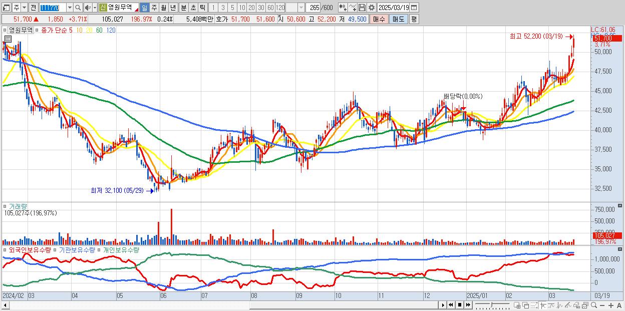 - 영원무역 (52,000원 ▲ 4.31% , 시총: 23,042억, 거래량: 97,558, 거래대금:50억, KOSPI)