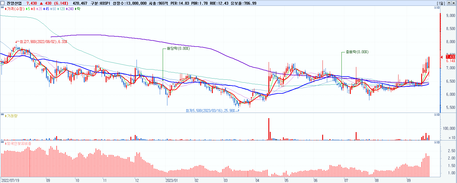 - 진양산업 (7,430원 ▲ 6.14% , 시총: 966억, 거래량: 431,357, 거래대금:31억, KOSPI)